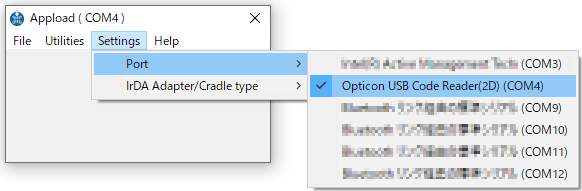 - [Settings]メニューの[Port]をクリックし、OPH-5000iが接続されているポートを選択します。OPH-5000iが接続されているポートには"Opticon USB Code Reader(2D)"と表示されています。